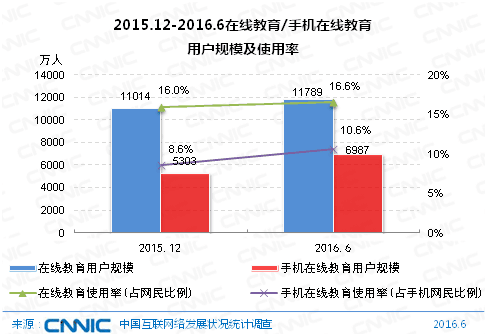 2015.12-2016.6 在線教育/手機在線教育用戶規模及使用率圖