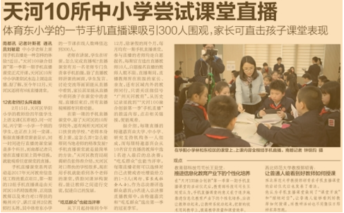 2017年2月15日下午,廣州天河區華陽小學、梅州興寧第一小學給班上的學生上語文課《五彩池》這兩節同樣的課,均在網上直播。這是“天河100融合創新”第一季手機直播課堂中的兩個現場,該系列活動是2017年天河教育信息化工程的重點項目,由天河區教育局主辦。從2月15日開始,持續到今年12月份,預計將有近百堂課參與直播。場外的人點擊相關鏈接,便能通過手機,走進孩子們的課堂。