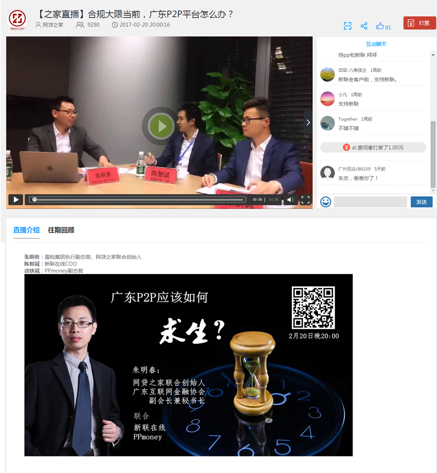案例一:網貸之家通過保利威視直播平臺進行手機直播,邀請網貸之家聯合創始人朱明春、新聯在線以及PP money負責人在線與網友共同探討廣東P2P平臺應該如何求生,吸引了9000多人在線觀看。
