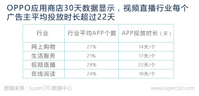 Super CPD 對 OPPO 應用商店網上購物、生活服務、視頻直播和在線閱讀四個行業 APP 進行研究,在行業 APP 廣告主的投放數量來看,視頻直播廣告主數量有 28% 成為行業之首,其次是網上購物 27% 和在線閱讀 24%,最后是生活服務 21%。