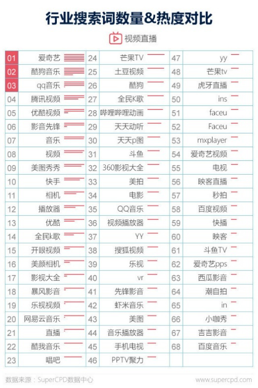 行業搜索數據顯示,視頻直播熱門搜索詞數量大于其他三個行業總和,網民搜索行為以品牌詞為主。網民搜索范圍主要包括:視頻、音樂、美顏、 自拍和直播類品牌詞。