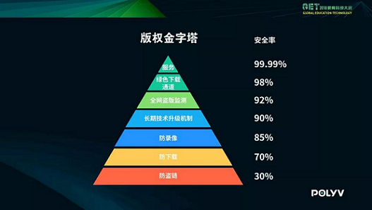 此外,周鑫在演講中分析了國(guó)內(nèi)在線(xiàn)教育視頻課程盜版的亂象,分享了保利威在視頻版權(quán)保護(hù)方面的解決方案。周鑫表示,從視頻版權(quán)金字塔層面上看,國(guó)內(nèi)大概70%的教育機(jī)構(gòu)都僅停留防盜鏈層,安全率只有30%。