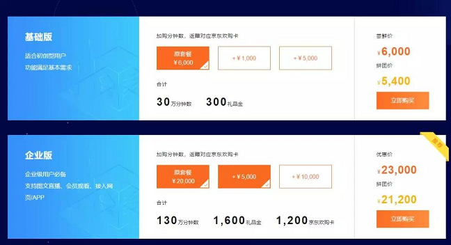 直接購買云點播、云直播享優惠價,拼團購買(兩人成團)更優惠。