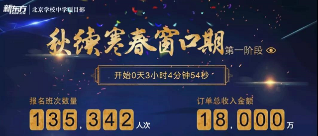 去年,新東方北京優能中學實現了實現了報名班次和訂單收入的重大突破,開放3小時,報名人次13.5萬,同期收入1.8億,創造了新東方線下學校窗口期內報名的記錄。