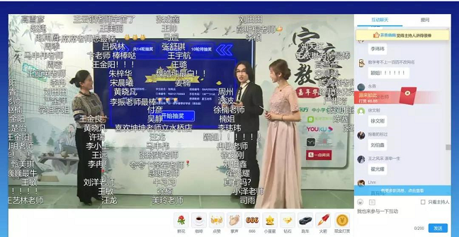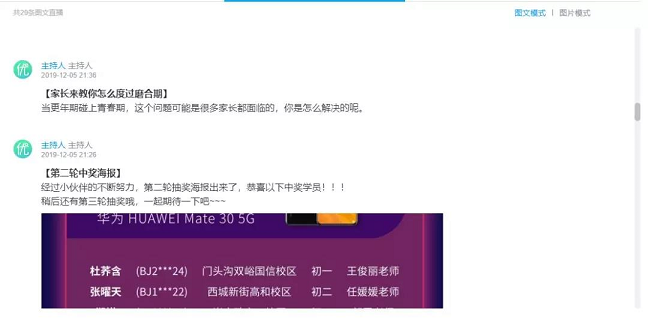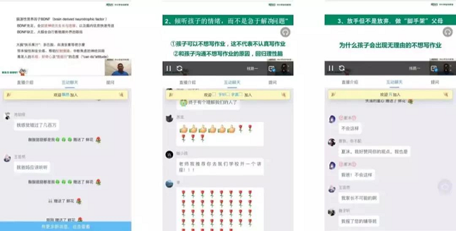 現場有嘉賓、主持人、學生和家長。老師會針對某個主題進行探討,采用抽獎送禮等方式和現場用戶互動,最后還會請家長對課程效果進行點評。