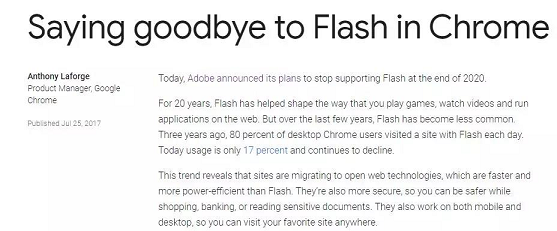 早在2017年,Adobe宣布停止支持Flash,這位曾經風光無兩的網頁播放器王者,就已經被宣判了死緩。這也預示著,互聯網開始逐漸向Flash時代告別。