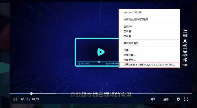 其實只需要右鍵點擊網頁上的播放器,在彈出的菜單欄中就可以區分兩個播放器了,一般來說使用Flash播放器的網頁都會顯示有“關于Flash……”的一行文字。