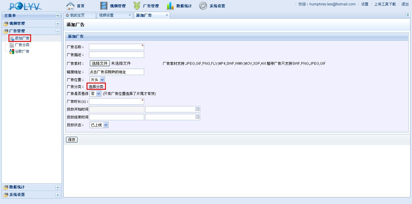 操作方法:點(diǎn)擊廣告管理下的添加廣告選項(xiàng),設(shè)置完廣告后保存即可為視頻添加廣告。注意:若未選擇廣告分類,默認(rèn)為所有視頻添加廣告,若選擇了相關(guān)視頻分類,新創(chuàng)建廣告對(duì)所選視頻分類生效。