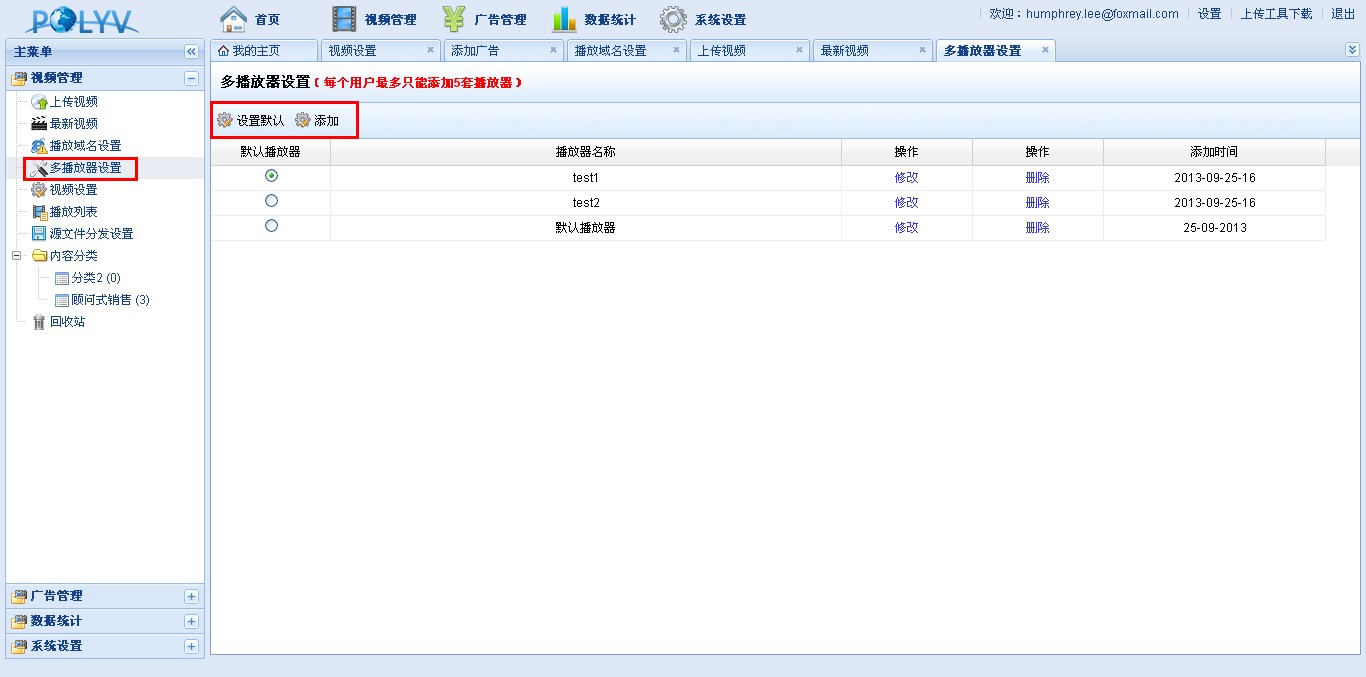 添加播放器,點(diǎn)擊視頻管理下的多播放器設(shè)置,點(diǎn)擊添加可創(chuàng)建新播放器。