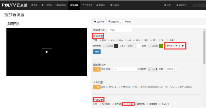 2.點擊【修改】后進入如下圖界面,在右側菜單下拉找到【皮膚設置】,將不透明度設為0;找到【片尾設置】,選擇“無片尾”,設置完點擊上方的【保存】即可。