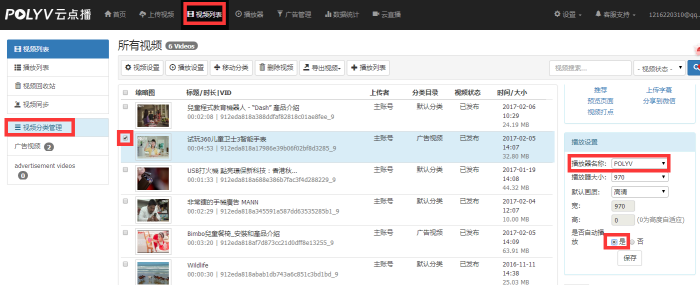 3.點擊頂部功能列表的【視頻列表】,選擇視頻(或在【視頻分類管理】中選擇視頻),在右側小窗口找到【播放設置】:選擇與上邊步驟相同的播放器,將自動播放設置為“是”,點擊【保存】。