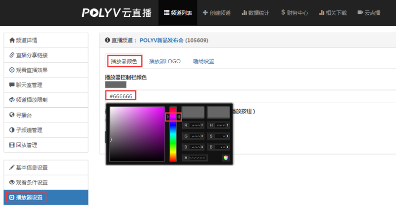 2.點(diǎn)擊【播放器設(shè)置】——【播放器顏色】,在【播放器控制欄顏色】那里拖動(dòng)指向標(biāo)更改播放器的顏色,用小圓圈標(biāo)注,點(diǎn)擊彩色圓確認(rèn),然后選擇觀眾在觀看直播時(shí)是否自動(dòng)播放,點(diǎn)擊保存即可,如圖: