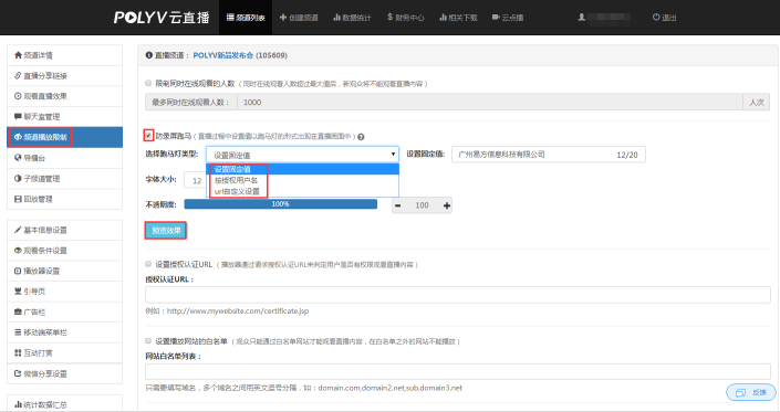 2.進入【頻道播放限制】頁面后,勾選【防錄屏跑馬】,設置跑馬燈類型(包括【設置固定值】、【按授權用戶名】、【URL自定義】三種類型),用戶還可修改跑馬燈的樣式包括字體大小、字體顏色、不透明度。如圖: