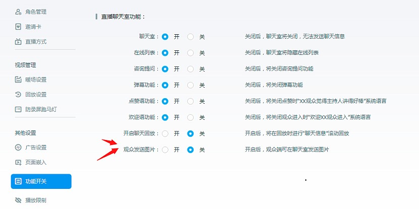 觀眾發(fā)送圖片開關(guān)入口:我的直播–>功能開關(guān)–>觀眾發(fā)送圖片
