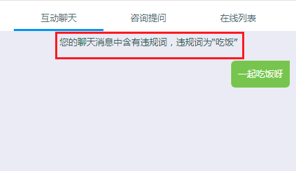 功能描述:講師、助教、管理員發(fā)送的聊天消息含有違規(guī)詞時(shí),出現(xiàn)提示語(yǔ):您的聊天消息中含有違規(guī)詞,違規(guī)詞為“XX”。