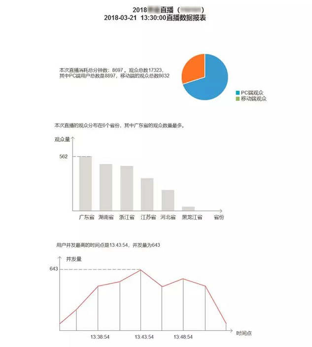 在直播結束后,直播后臺會自動生成詳細的數據統計,包括實時在線人數、用戶訪問次數、觀眾地域分布、播放終端等多個維度。
