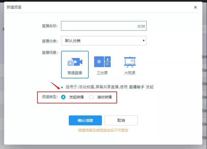 2.創(chuàng)建新的直播頻道,「頻道類型」默認(rèn)為「發(fā)起轉(zhuǎn)播」,即總頻道,若為分頻道請選擇「接收轉(zhuǎn)播」,分頻道有「接收轉(zhuǎn)播」標(biāo)識