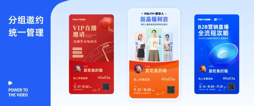 直播前高效邀約: 接入一客一碼功能后,市場部會在銷售后臺提前配備多套宣傳物料,適配不同的客戶進行邀約,如面向新客要邀約的物料與話術會更全面,而觀看直播的鏈路中也會進行留資動作;而面向老客的物料與鏈路則會精簡,不會再次對老客進行留資等干擾動作;此外還會準備細分的話題海報或嘉賓海報用于定向邀約,銷售只需前往后臺根據手頭客戶實際情況獲取物料,即可高效完成直播邀約。