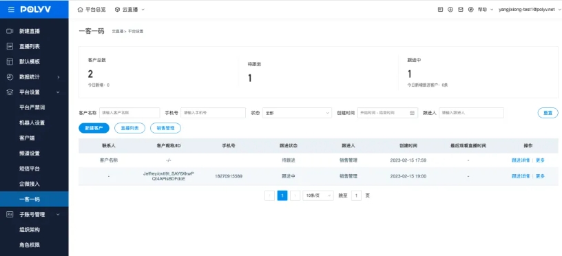 在私域直播板塊中,不論是企業自建直播體系還是接入私域直播服務商的能力,都能在平臺功能上擁有更高的定制自由度,同時由于私域數據的私有性,在直播結束后也能拿到更加詳盡的直播數據。接下來以私域直播服務商保利威的一客一碼功能為例,我們來梳理銷售角色在一場私域直播的前中后環節如何高效精準完成客戶的管理與跟進。