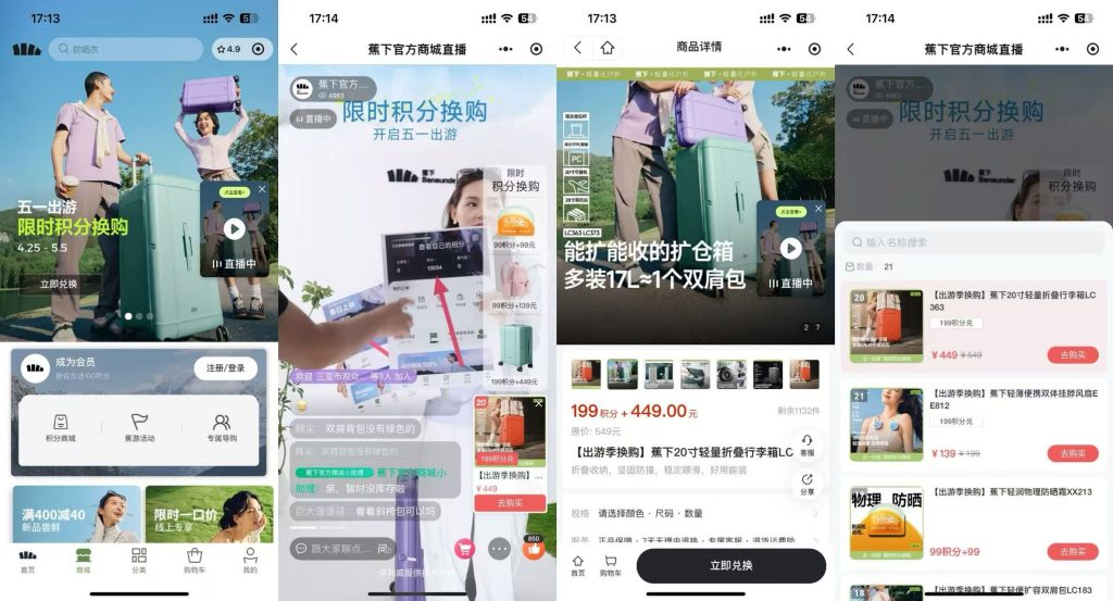 保利威為蕉下提供小程序webview直播技術(shù)方案,嵌入H5觀看頁(yè),集成配置簡(jiǎn)單,可快速上線。營(yíng)銷帶貨功能包括商品庫(kù)、卡片推送、直播小窗播放功能,促進(jìn)用戶下單轉(zhuǎn)化,加快業(yè)務(wù)變現(xiàn)。蕉下的直播間樣式豐富、功能齊全,后續(xù)由保利威維護(hù)更新。