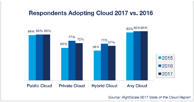 2017年云計算調查顯示,雖然混合云仍然是首選的企業戰略,但公有云的采用正在不斷增長,而私有云的采用趨于平緩,越來越少的公司考慮優先建立私有云。 這與去年的調查有所改變,去年私有云使用方面取得了強勁的增長。