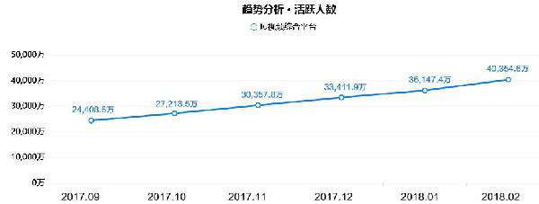 易觀千帆數(shù)據(jù)顯示,2018年2月短視頻綜合平臺(tái)行業(yè)活躍用戶數(shù)持續(xù)增長,達(dá)到40354.6萬的歷史新高。行業(yè)領(lǐng)頭羊快手在2017年年底,總用戶數(shù)已超過7億,日活躍用戶超過1億;追趕者抖音迅速崛起,在2017年春節(jié)期間增長了3000萬DAU,超越了“西瓜”和“火山”,成為頭條軍團(tuán)在短視頻上的新旗艦。