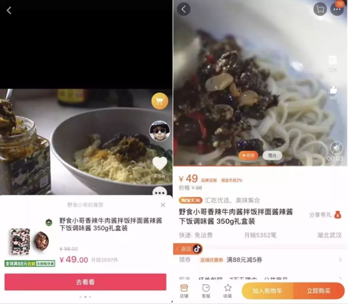 賣(mài)貨,這條微博紅人走過(guò)的路,在短視頻為載體的抖音上可能更有種草力。擁有440萬(wàn)粉絲的野食小哥是一個(gè)美食紅人,當(dāng)抖音在3月給一批紅人開(kāi)通淘寶購(gòu)物車(chē)鏈接之后,他就賣(mài)起了定制款牛肉醬。而據(jù)野食小哥簽約的MCN機(jī)構(gòu)大禹的工作人員透露,開(kāi)賣(mài)后幾天,流水最高達(dá)到過(guò)一天7萬(wàn)元。