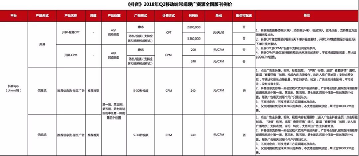 使勁花錢(qián)、再使勁賺錢(qián),是頭條的風(fēng)格。2017年下半年,抖音開(kāi)啟了商業(yè)化,此時(shí)距離抖音上線還不到一年。36氪獲取了一份抖音今年第二季度的廣告刊例價(jià),均大幅高于其他內(nèi)容平臺(tái)。