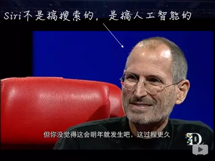 喬布斯在 D8 訪談中被問及蘋果收購 Siri 的原因是否是想與谷歌競爭搜索業務時答曰:他們(指 Siri)不是搞搜索的,他們是搞人工智能的。