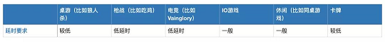 在手游場(chǎng)景下,不同游戲類型對(duì)實(shí)時(shí)音視頻的要求不同,比如狼人殺這樣的桌游,語音溝通是否順暢,對(duì)游戲體驗(yàn)影響很大,所以對(duì)延時(shí)要求較高。其它類型游戲具體如下方表格所示。