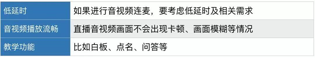 另一類是 K12 在線教育,比如英語外教、部分興趣教學(xué),通常會(huì)有一對(duì)一或一對(duì)多的師生連麥功能,它對(duì)直播場(chǎng)景的要求包括: