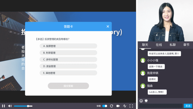 同時,保利威視頻云的云課堂產品還擁有眾多的教學輔助功能,非常方便培訓講師的授課以及后期的評估。云課堂教學培訓功能十分豐富,支持音視頻連麥、在線答題、課程簽到、提問、數據統計、多種課件教學、畫筆、白板等等功能,這些功能讓講師在線上授課更加得心應手。