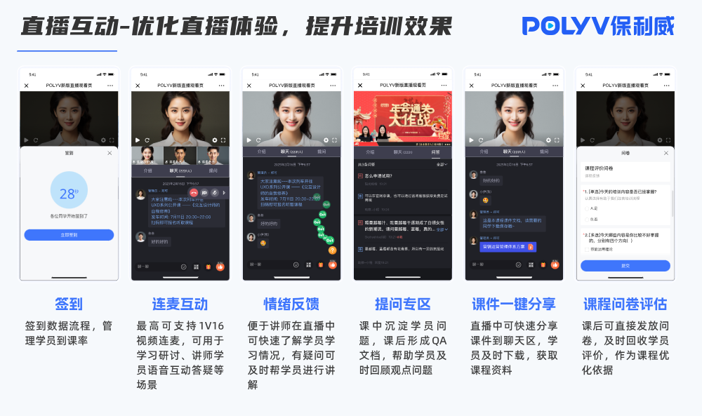 保利威在直播間內置多種互動功能,包括:實時彈幕、評論互動、簽到打卡、問卷反饋、直播連麥答疑、禮物激勵、點贊打賞。這些功能可以靈活開啟,適配語言培訓、興趣教學、公開課等不同教學場景,有效提升觀眾參與感和留存時長。