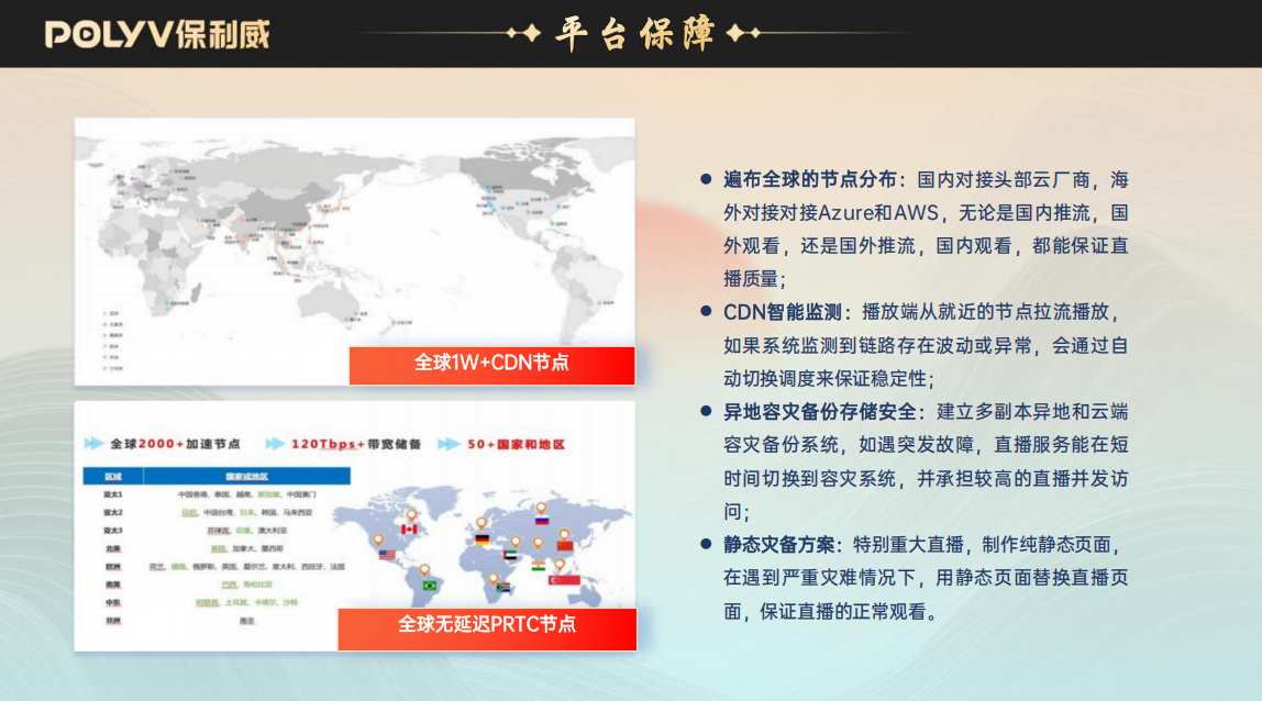 年會(huì)直播的網(wǎng)絡(luò)環(huán)境可以說(shuō)是“千人千網(wǎng)”,既有移動(dòng)4G/5G搭建的戶分會(huì)場(chǎng)、Wi-Fi支撐的主會(huì)場(chǎng),也有偏遠(yuǎn)廠區(qū)的不穩(wěn)定網(wǎng)絡(luò)、跨國(guó)分支機(jī)構(gòu)的長(zhǎng)距離鏈路,任何一處網(wǎng)絡(luò)波動(dòng)都可能導(dǎo)致頒獎(jiǎng)卡頓、連麥中斷等尷尬場(chǎng)景。保利威年會(huì)直播能輕松hold住復(fù)雜網(wǎng)絡(luò)環(huán)境,通過(guò)實(shí)時(shí)數(shù)據(jù)采集、智能分析與動(dòng)態(tài)調(diào)控等手段,保障直播畫(huà)面流暢、互動(dòng)環(huán)節(jié)穩(wěn)定、突發(fā)狀況可控。
