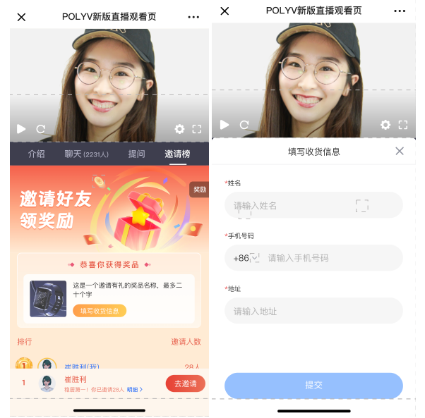 裂變公式:開啟觀眾邀請好友參與直播,觀眾可在直播間中參與邀請活動。邀請活動結(jié)束后,邀請人數(shù)處于對應(yīng)獎勵梯度中,則可以活動對應(yīng)獎品,此時可以按照領(lǐng)獎方式領(lǐng)取獎品。