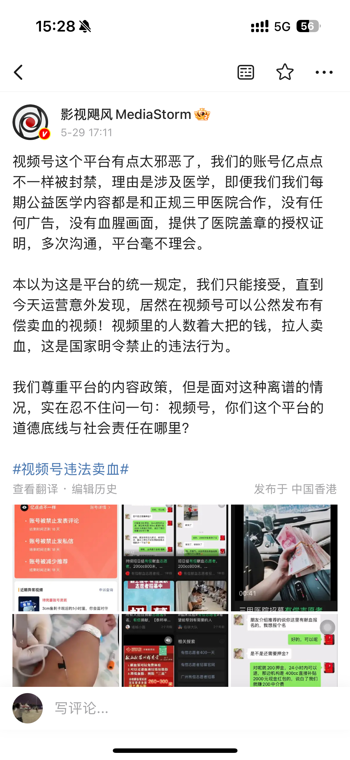 團隊一度認為這是平臺的統一規則而選擇接受,但隨后運營人員意外發現,視頻號平臺上竟公然存在大量涉嫌“有償賣血”的違法視頻。這些視頻內容露骨,直接展示人員清點現金、招攬他人參與賣血——此行為為國家法律法規明令禁止。 一邊是嚴謹合規的公益醫學科普內容被封禁,另一邊是危害明顯的違法視頻持續存在,這種鮮明的對比令影視颶風團隊深感憤慨。其在聲明中嚴正質問:“我們尊重平臺的內容政策,但面對如此離譜的雙重標準,不得不發出嚴厲質疑:視頻號,你們的道德底線與社會責任究竟在哪里?”