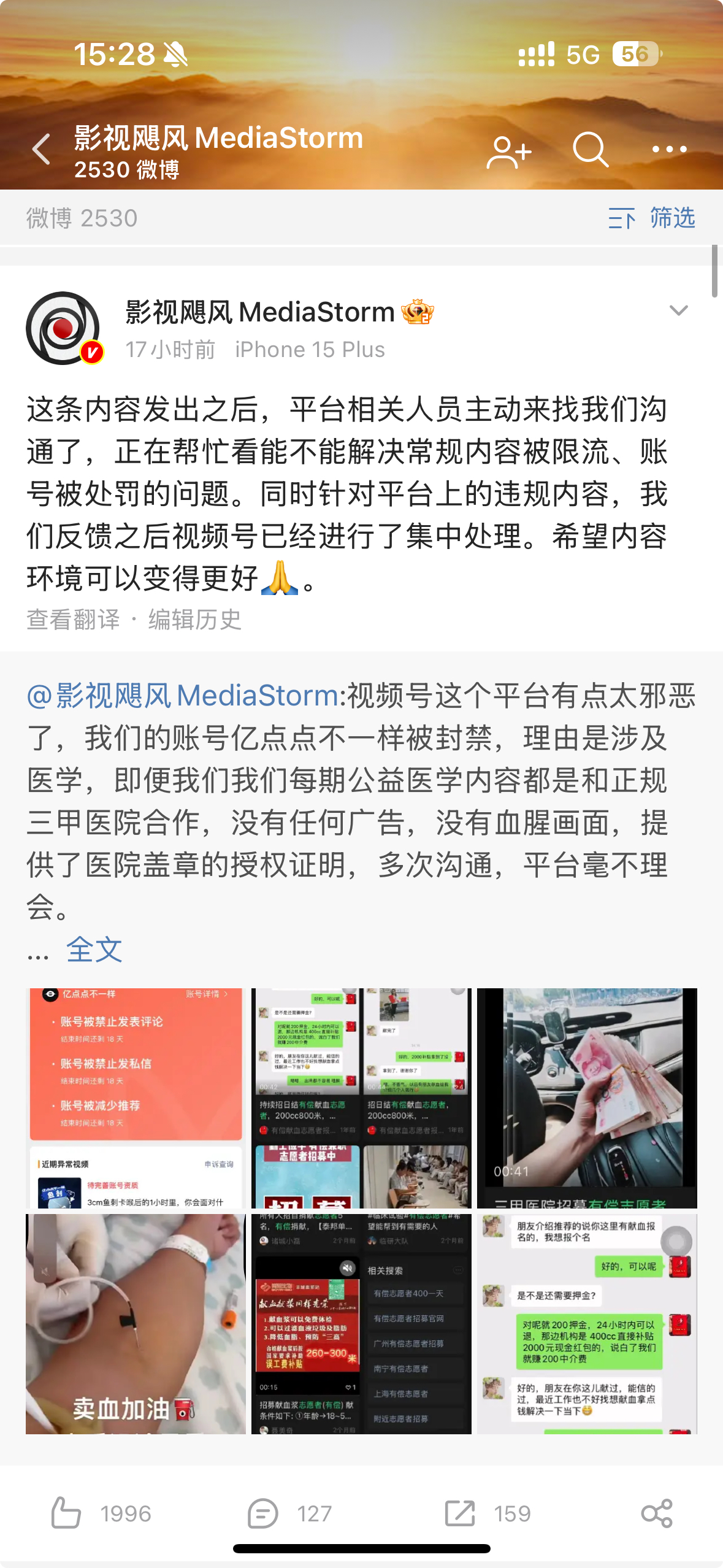 事件在社交媒體發酵后迎來轉機。影視颶風透露,平臺相關方已主動與其聯系,開始著手解決“億點點不一樣”賬號常規內容遭限流及被處罰的問題。同時,團隊舉報的違規賣血視頻,在反饋后已得到視頻號平臺的集中清理。